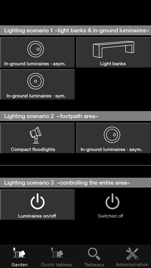 The BEGA-GVS app offers a global visualisation software interface optimised for mobile devices, allowing the comfortable monitoring and control of lighting systems by smartphone, tablet and smart TV box.