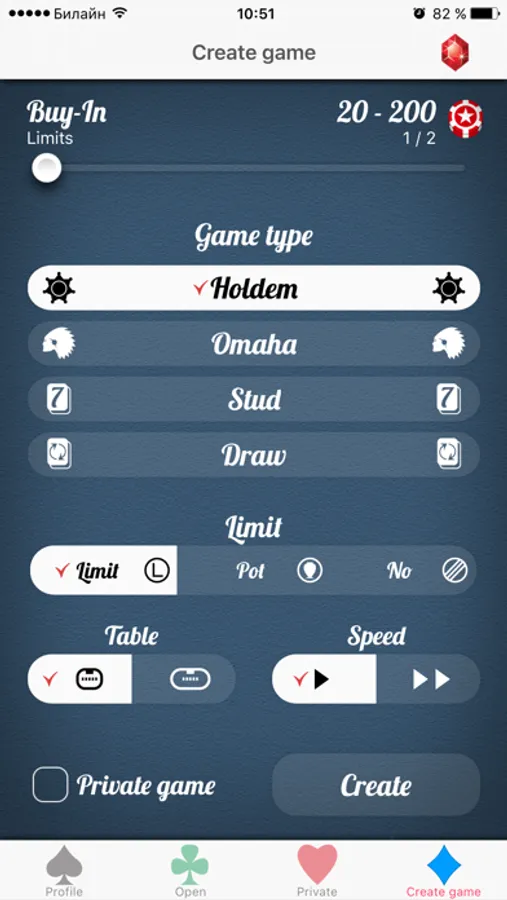 • Four types of game (Texas Hold'em, Omaha, 7-Stud, Draw poker).