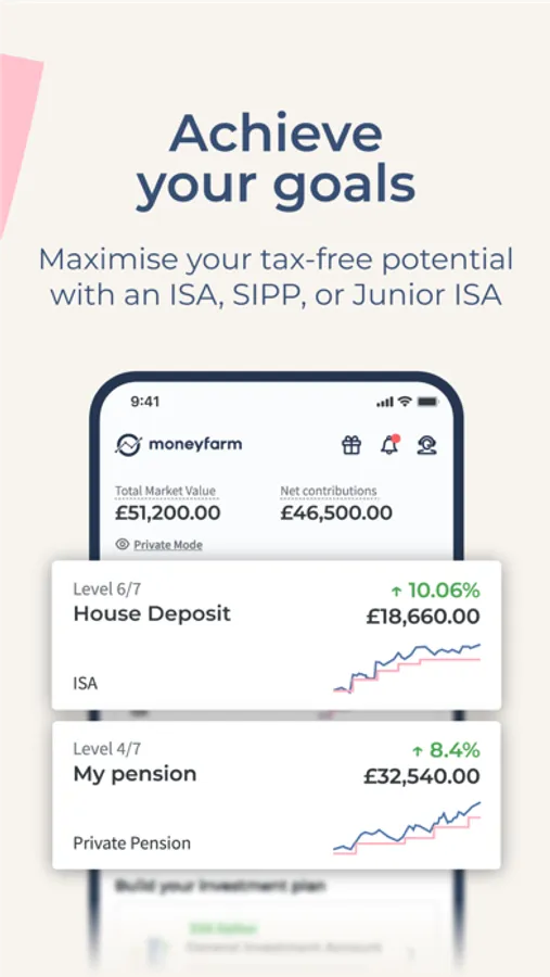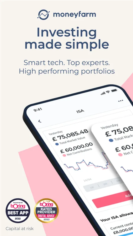 Our award-winning Moneyfarm investment app offers cost-efficient investments at the touch of a button, complete visibility of your investment account right in the app and an investment consultant at the end of the phone whenever you’d like to talk.