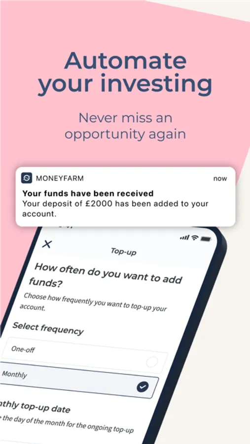 Save time and gain peace of mind. Moneyfarm is built for all levels of experience and is great for investors who want to track performance on the go. Our technology is designed to automate your investing experience and allow you to be hands-off if you want to be.