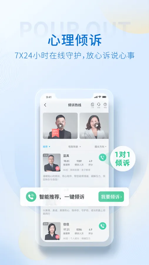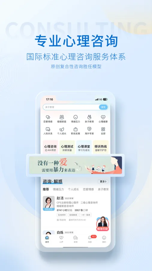 在这里有超过 42,000 名训练有素、经验丰富且经过认证的心理咨询师,涵盖婚恋情感、情绪压力、亲子关系、职场发展、人际交往等领域, 迄今为止,我们已帮助超过3900万人完成心理健康之旅,你会发现获得心灵的抚慰如此简单。