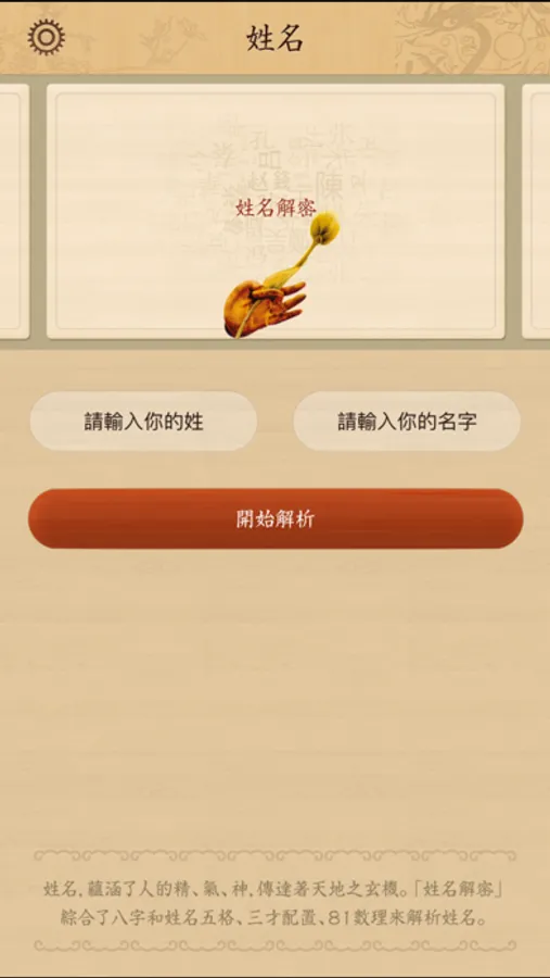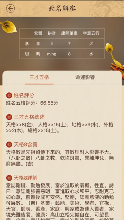 姓名,蘊涵了人的精、氣、神傳達著天地之玄機。姓名解密綜合了八字和姓名五格、三才配置、81數理來解析姓名。詳細解密你的三才五格,以及姓名對你基礎運,成功運,人際關系,性格等等的影響。