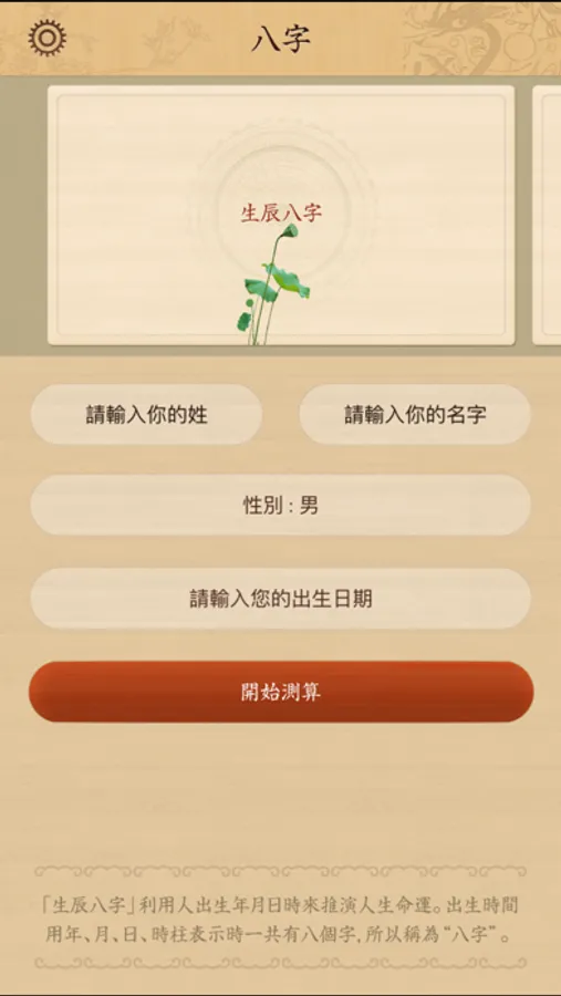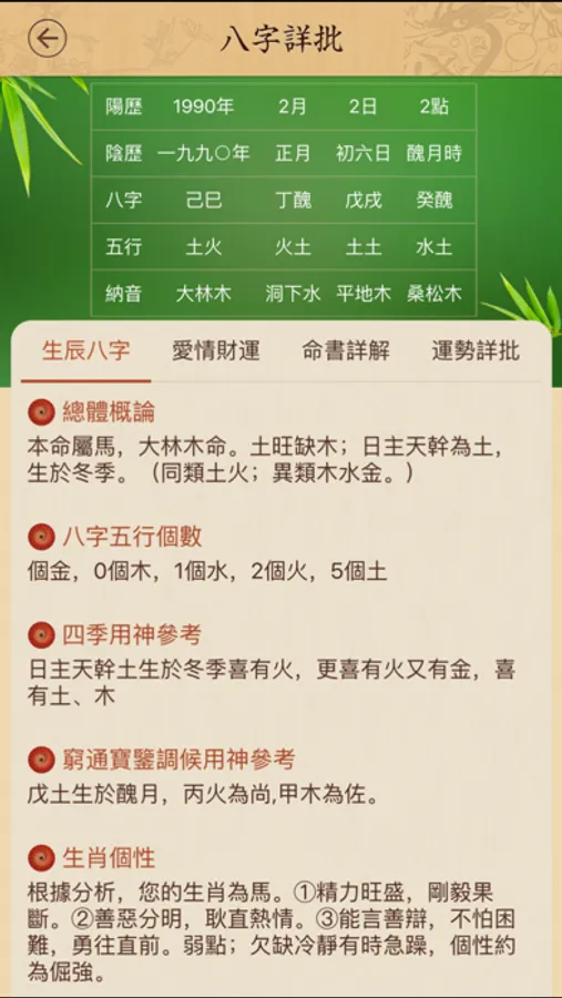 采用大中華地區最傳統,最準備的八字排盤,根據您的姓名,出生日期,性別來做分析。詳細解密出你的生辰八字,愛情財運,命書詳解,運勢詳批。對自己的八字命理,愛情運勢,財富運勢有詳細了解。大中華地區算命應用首創命書詳解,對你的骨重,命書作最詳盡的分析。運勢詳批更是對你未來12年的每年大運進行詳細批述,讓你更加全面的掌控自己的未來運勢。