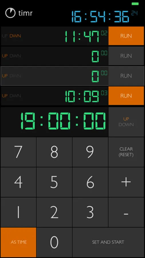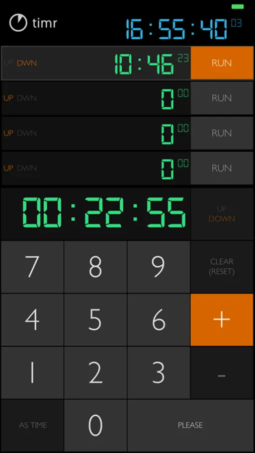 Four independent timers/stopwatches that counts up and down, and keeps track of overtime. Do live additions and subtractions, and count to specific timestamps.