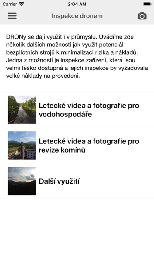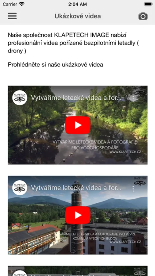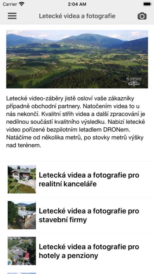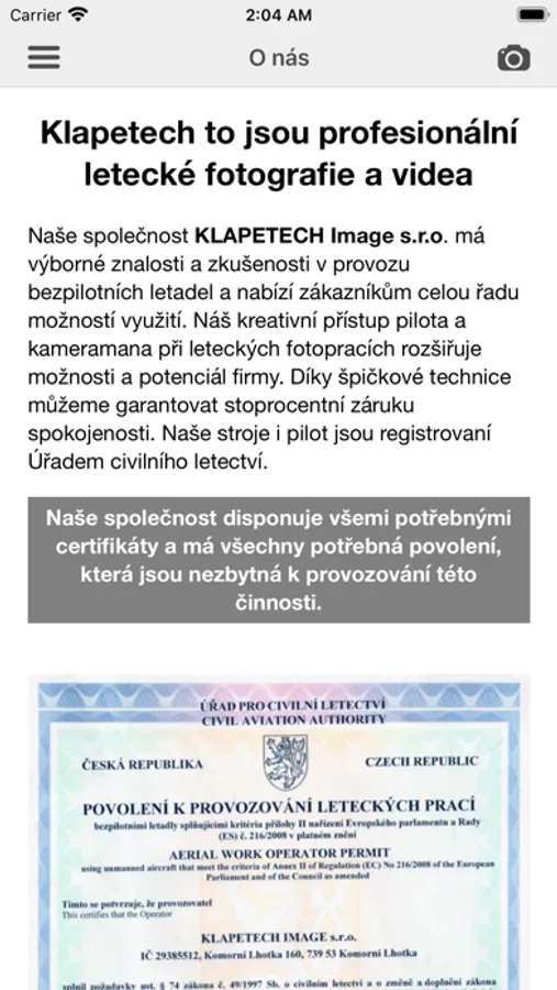 Aplikace Klapetech poskytuje důležité informace o firmě Klapetech s.r.o., zabývající se profesionálními leteckými fotografiemi a videi. V aplikaci naleznete veškeré informace o naší firmě, služby které poskytujeme a ceník naší práce. Aplikace disponuje také ukázkovými fotkami v galerii a jsou zde i videa natočena našimi drony. V neposlední řadě zde naleznete i kontakt na naší firmu s rychlými odkazy pro volání, nebo zaslání e-mailu.