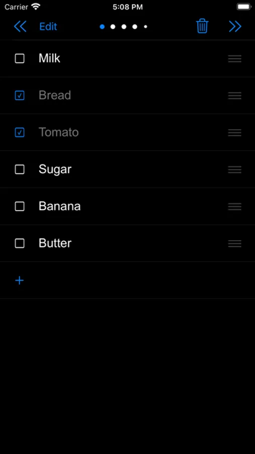 This app contains 6 pages. User and swipe left/right (outside the list items) to move next/previous pages.