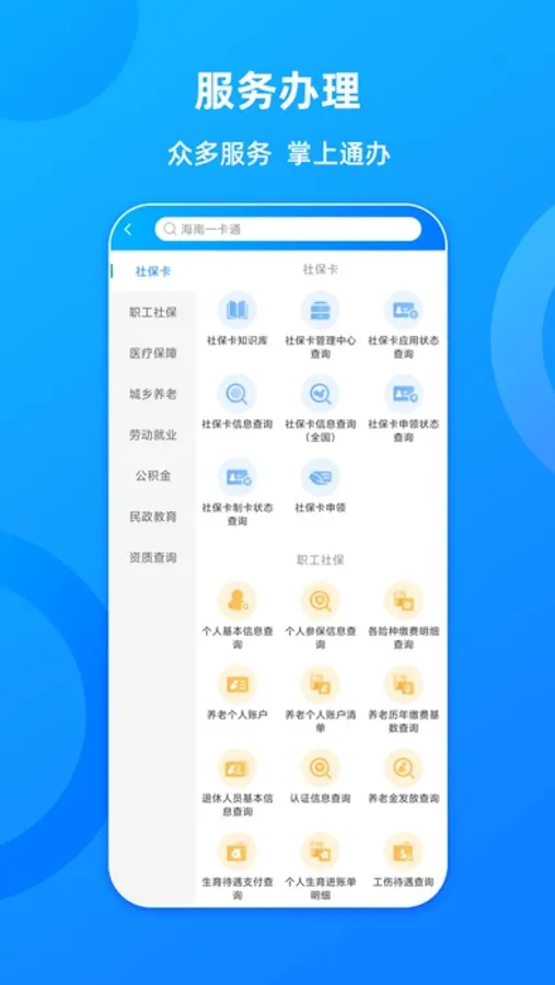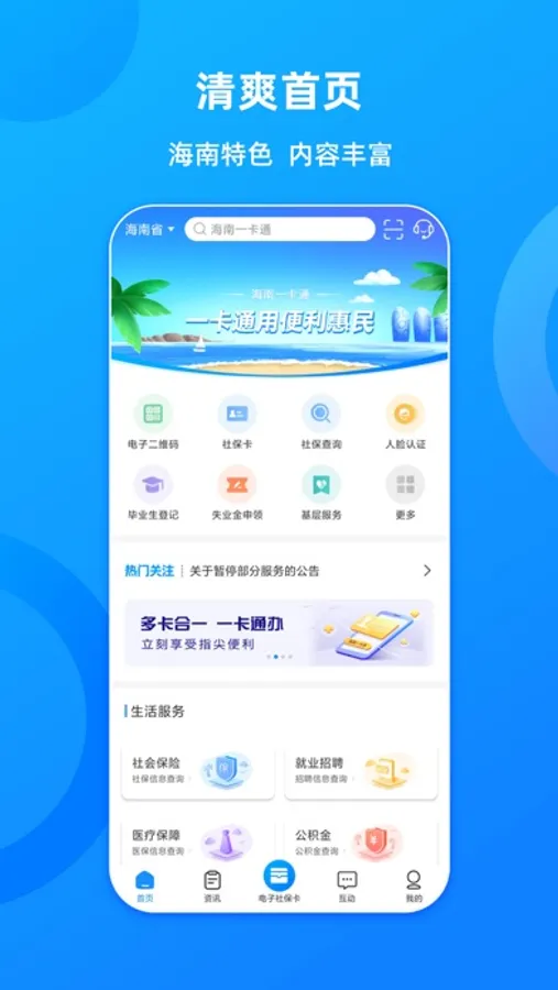 “海南一卡通”是海南省一卡通移动端服务渠道,作为海南省社会保障卡一卡通移动APP官方服务品牌,由海南省社会保障卡一卡通中心建设,基于“移动互联+便民生活”设计理念,集成社保卡办理及查询、电子社保卡、社会保险、就业创业、社会化认证、公积金查询等便民服务。