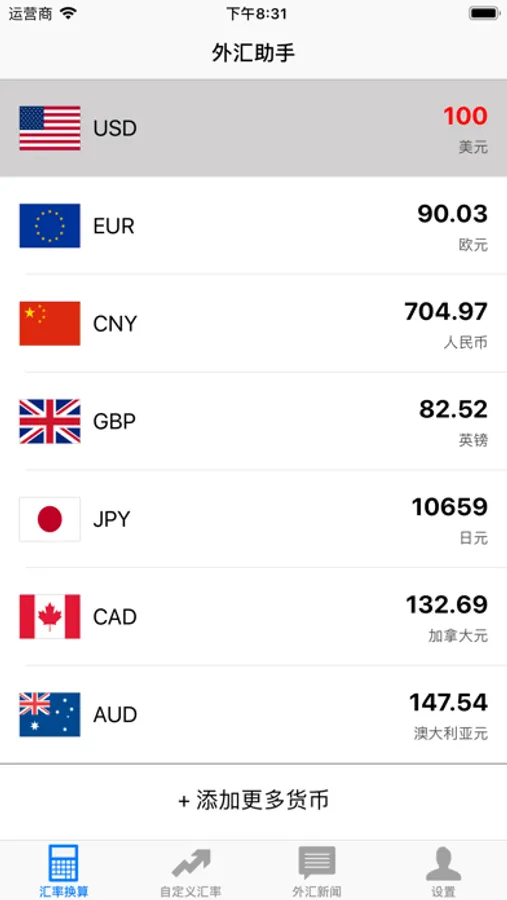 可自定义关注的外汇列表,相关汇率一目了然