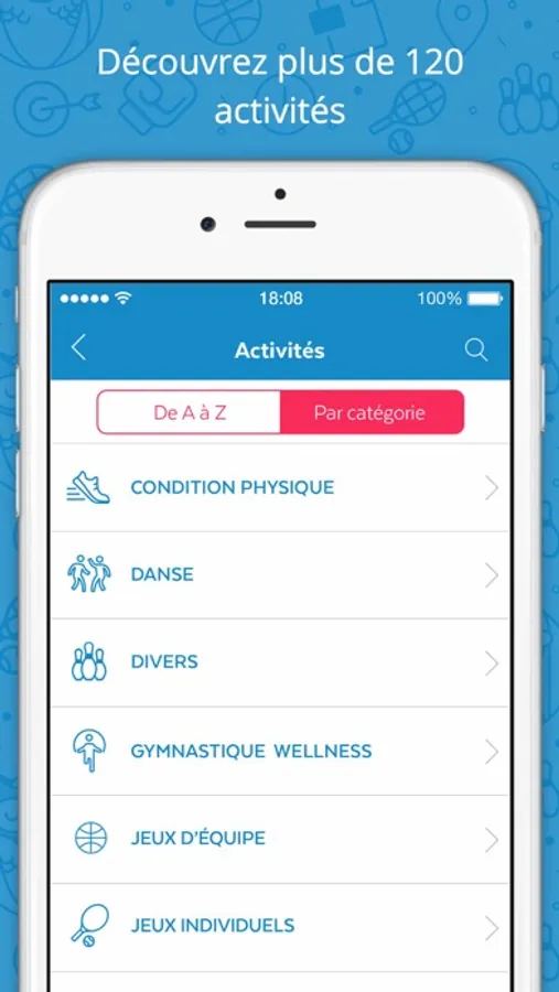 - Catégories : condition physique, danses, gymnastique wellness, jeux d’équipes, jeux individuels, sports aquatiques, sports d’hiver, sports de combat, sports individuels et techniques.
