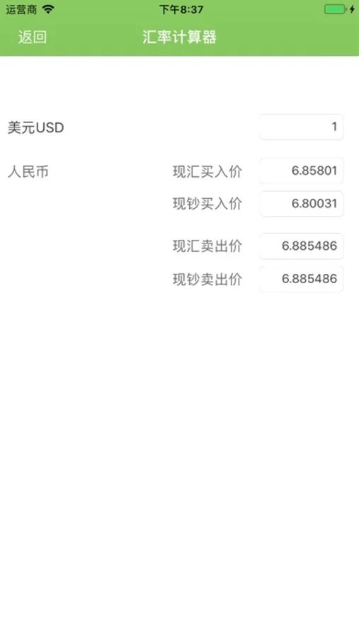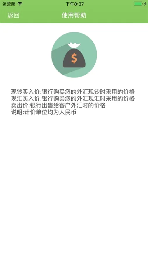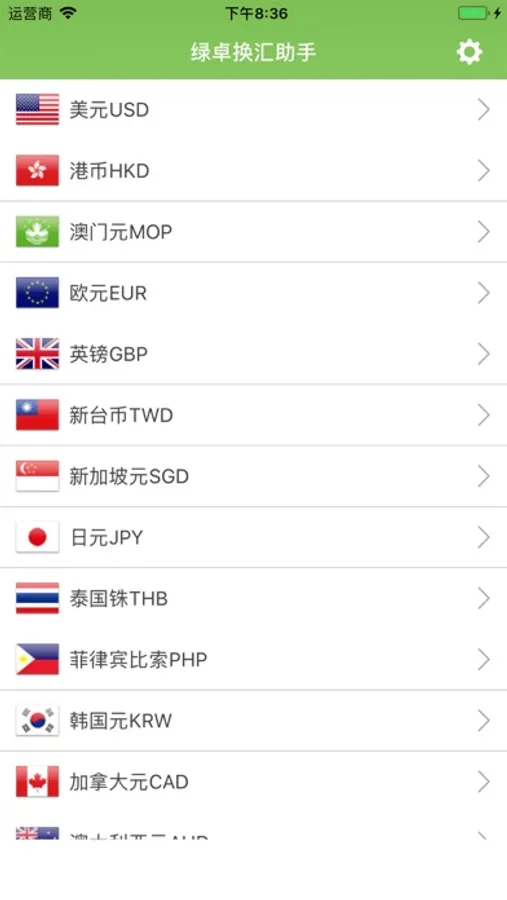 本软件包含美元、英镑、日元、韩元、泰铢、港币、澳门元、欧元、新加坡元、马来西亚元等十几种外币和人民币之间的兑换。