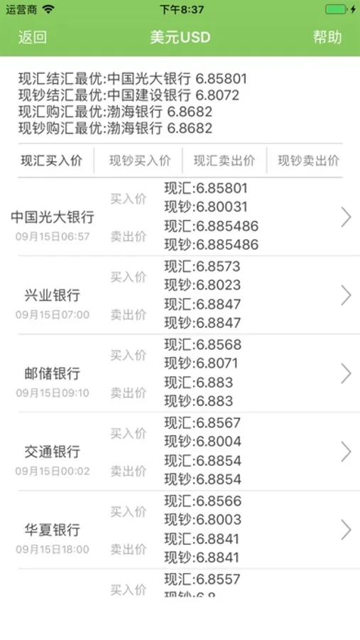 《绿卓换汇助手》可以方便的查看和比较各银行的实时外汇牌价,数据来源于浦发银行、华夏银行、上海银行、中国银行、兴业银行、中信银行、平安银行、广东发展银行、交通银行、招商银行、农业银行、光大银行、中国工商银行、民生银行、中国建设银行等,通过对比同一外汇在各个银行的不同兑换汇率,帮您推荐当前划算的结汇银行和换汇银行,从而使您在结汇时可以兑换更多的人民币,在购汇时可以使用更少的人民币,最终实现帮您赚钱或省钱的目的。