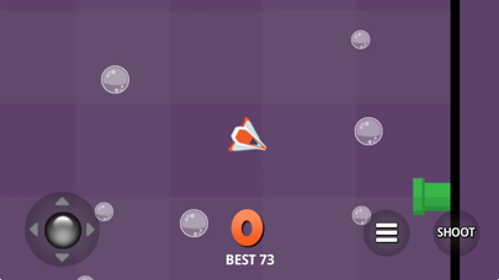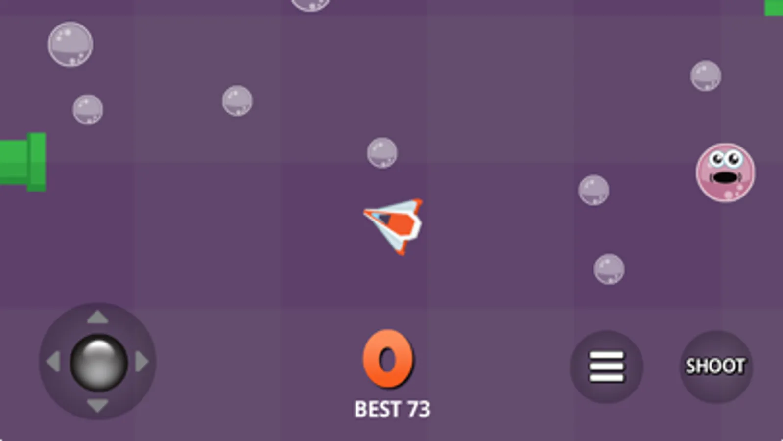 This a fun addictive endless play game where you need to fly your ship to shoot or ram as many bubbles as possible before they combine to form larger bubbles. The green pipes create endless bubbles which combine to create bigger bubbles. Pink girl bubbles create new bubbles and blue boy bubbles shoot at your ship. Two big bubbles create an indestructible killer bubble which will hunt you down and kill you. Use the virtual joystick to steer and move the ship. Touch the shoot button to shoot bullets at the bubbles.