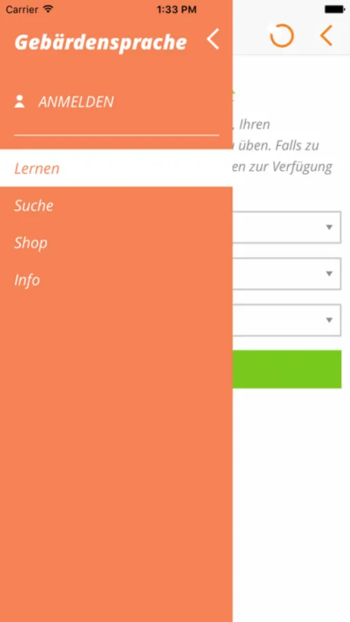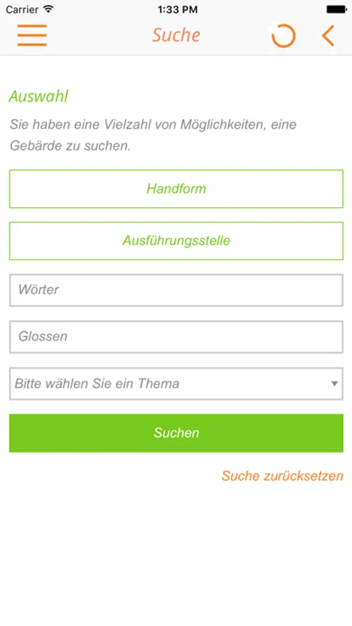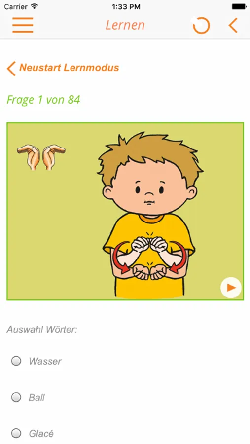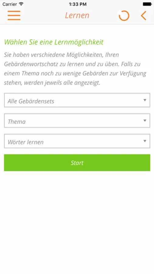 Lernmodus mittels Wahl der Bedeutung, der Glossen, nach Thema oder der Gebärden,