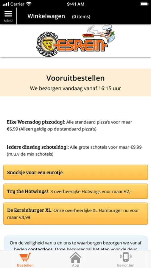 Download onze app en blijf op de hoogte van het laatste nieuws en de nieuwste acties, aanbiedingen en kortingen. Via onze app kunt u onze menukaart bekijken en direct vanaf uw telefoon uw bestelling plaatsen. U kunt via de app ook met iDEAL betalen!