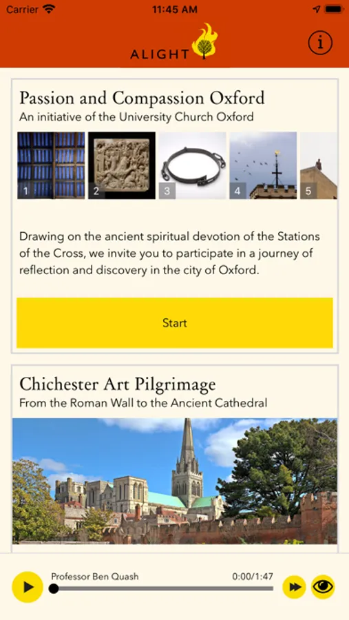 You can use the Alight features while following one of its trails, or from your own armchair. Put your headphones on, press play, and listen to both short commentaries and longer discussions.