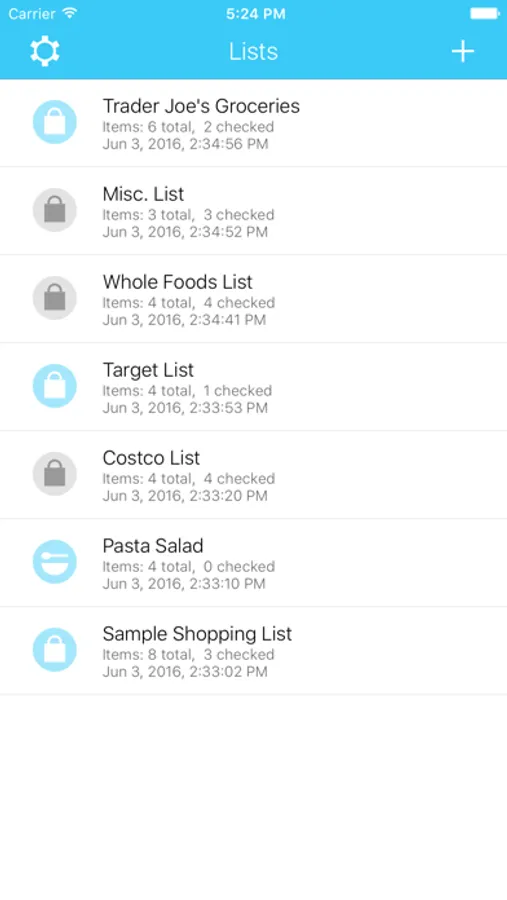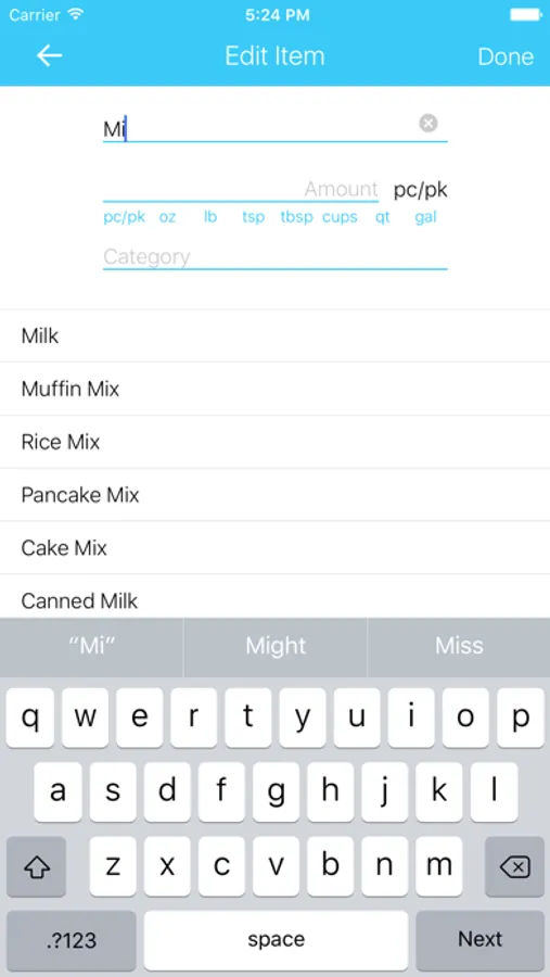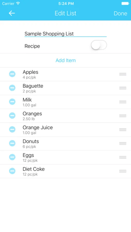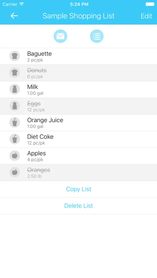 Start typing an item name and the app will suggest relevant grocery items. Choose items and the app will automatically add correct category and units. Sort items by category or drag items to reorder. Make copies of a list and manage multiple lists.