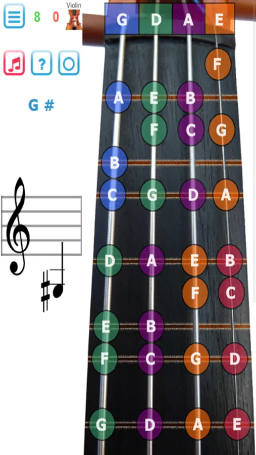 Possible display of notes placements on the fingerboard (the name of the note to play is then displayed with the same color as the note placement)