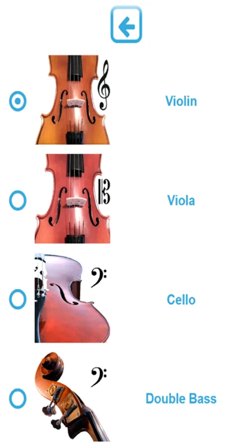 • Choice of notes to practice : choose which strings to pratice, positions among 13 possible ones (from open string to 7th position), flat, sharp.