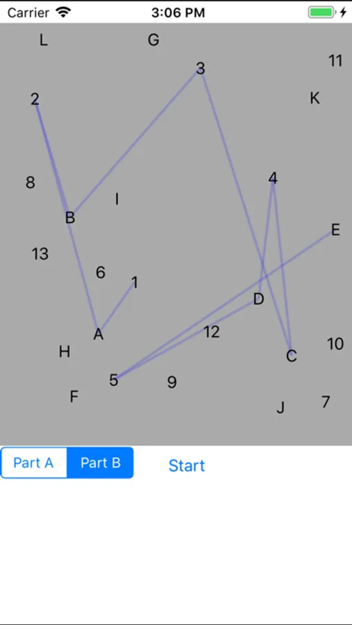 Part B: Touch the numbers (1 – 13) and letters (A – L) in an ascending order, but with the added task of alternating between the numbers and letters (i.e., 1-A-2-B-3-C..)
