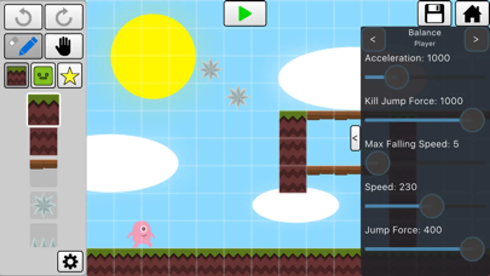 Create your own levels and play levels created by others, in this Super Mario Maker-like platform game by V-Play!
