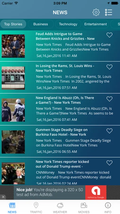 ⁃ News from top categories Top Stories, Business, Technology, Entertainment, Sports, Science and Health
