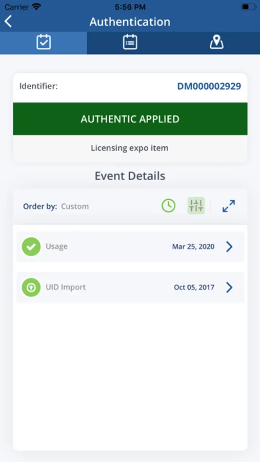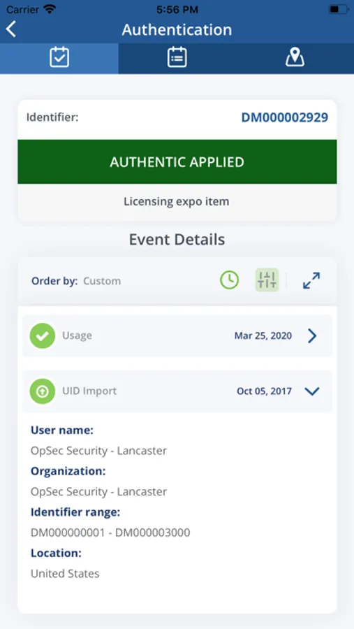 - Scan the 2d barcode (or manually enter the OpSec InSight UID in the ‘Authentication’ screen to verify authenticity and view product provenance details