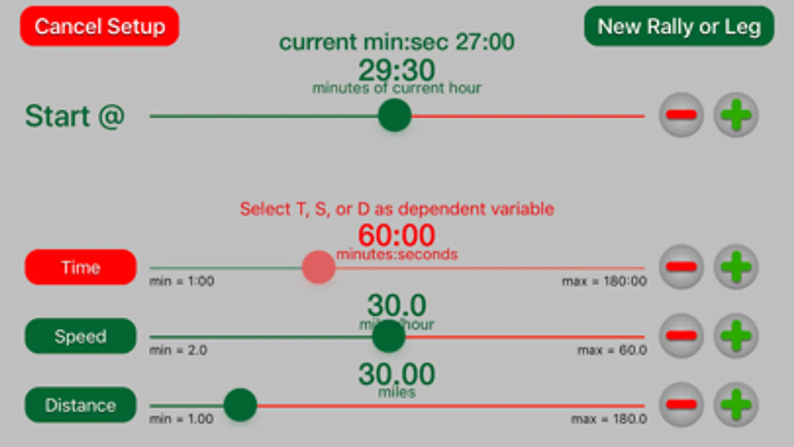 Set these conditions by touching the Setup button to access a screen where the starting time, course time, course speed, or course distance can be entered. When you've set these conditions, touch the green New Rally button in the upper right hand corner of the screen to return to the main screen where a map and your progress will be recorded.
