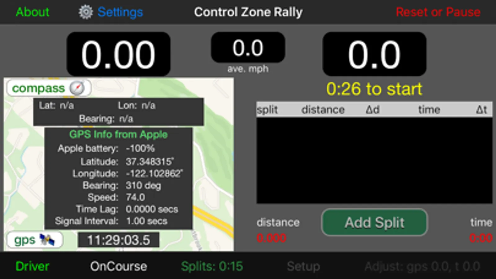 GPS inputs trace the path along the rally route. Measurements of actual versus ideal time and distance will be shown in seconds ahead or behind schedule. From time to time you may also record time and distance covered an the error against the ideal course time and distance by touching the "Add Split" button.