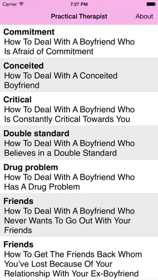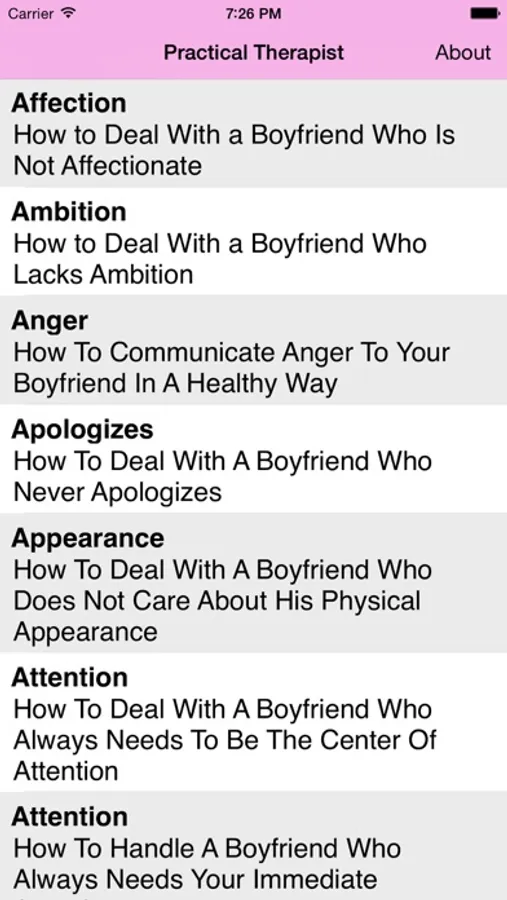 Have you ever been involved or are currently in relationship with a boyfriend and not known either what to say in a difficult situation or wondered why he acted the way that he did? Well, millions of girls and women feel the same way but do not have the opportunity or resources to seek professional advice. Our app, Why Boyfriends Do What They Do and What to Do When They Do It, offers sound advice on many common crises, situations, conflicts and interactions that girls and women encounter every day in their relationships with their boyfriends. Advice on dealing with lack of confidence, sex, assertiveness, hostility or shyness, aggressive boyfriends, boyfriends who constantly need to be the center of attention, and much, much, more is included in this app.