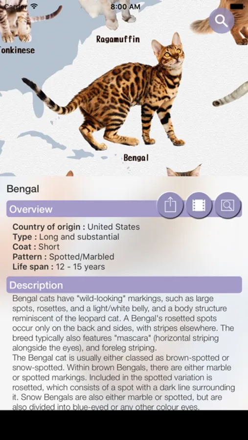 This is a pictorial book on domestic cat, for cat lovers. You can see pictures of 47 breeds of cat. We also give an explanation about the character of every cat (for example, about its type, its coat, its life span and its origin).