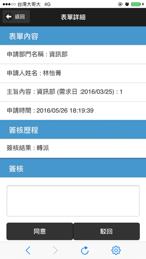 4.使用者於APP中進行簽核動作時,回傳Server (執行指定aspx網頁):帳號/表單單號/簽核結果/意見等資料;