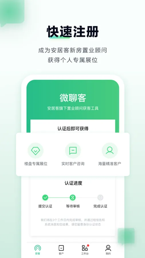即刻下载微聊客,免费注册成为安居客新房置业顾问。