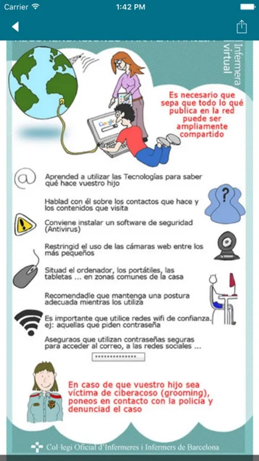 El contenido de la aplicación corresponde al portal Infermeravirtual.com, proyecto de educación por la salud del Colegio Oficial de Enfermeras y Enfermeros de Barcelona.