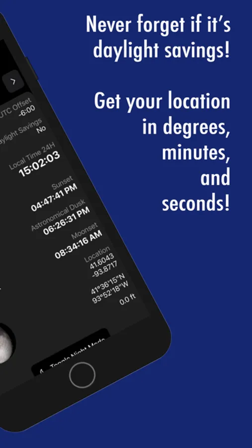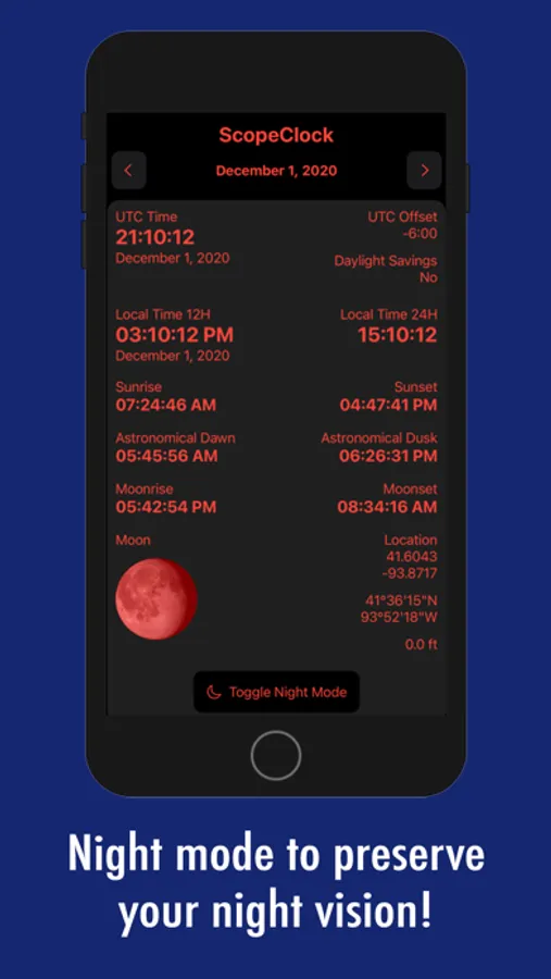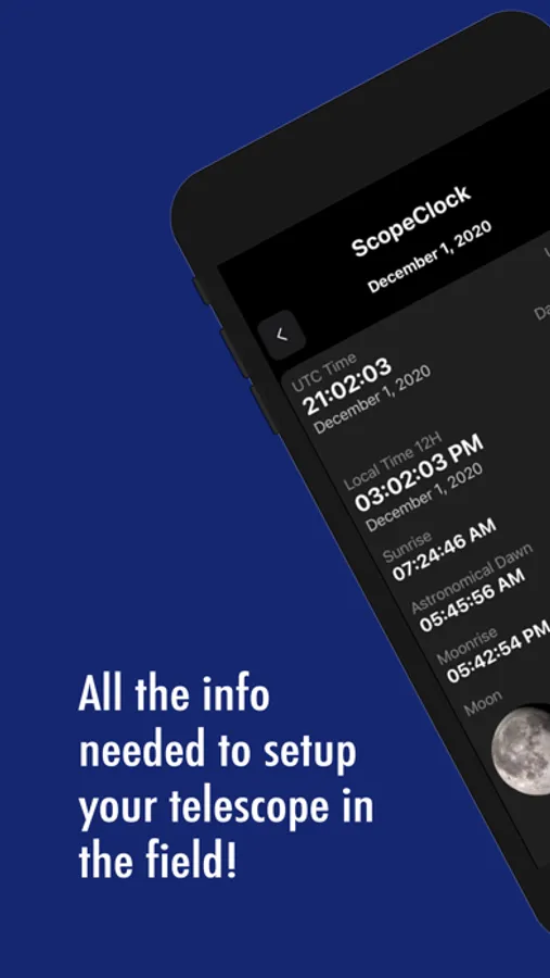 To help plan your observing, ScopeClock also shows you sunrise, sunset, astronomical twilight, moonrise, moonset, and moon phase.