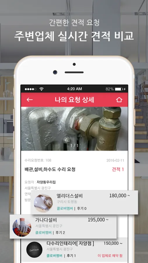 견적을 받게되면 업체 정보와 회원들이 남긴 수리후기, 업체 평점 등을 확인하고 업체를 선정하세요.