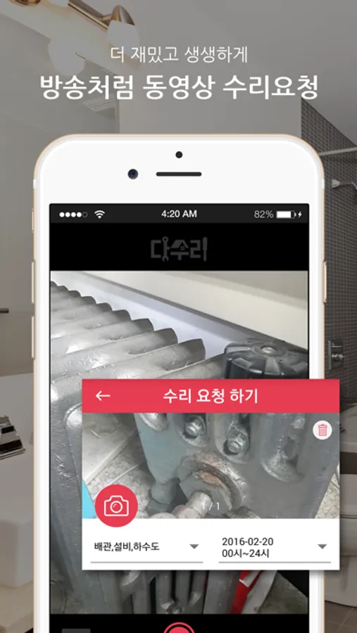 다수리는 불편하게 많은 정보를 입력할 필요가 없습니다. 수리할 곳의 사진 몇장과 생생한 동영상을 촬영하고 잠시만 기다리시면 됩니다.