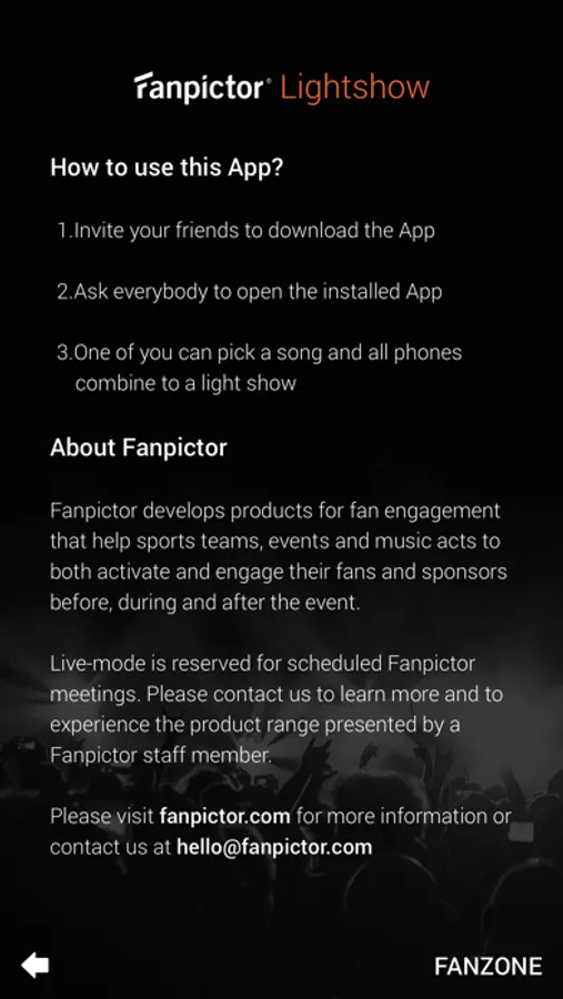 The Fanpictor App brightens your day! Install it on your and your friends’ phones and enjoy how all phones connect to a Lightshow!