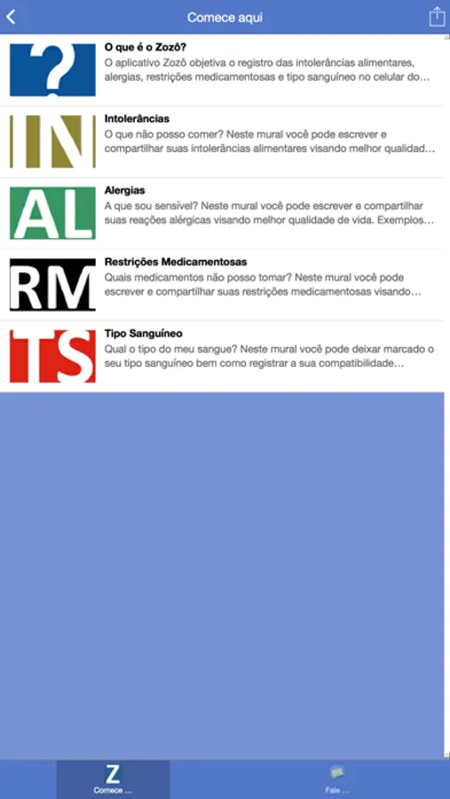 O Aplicativo ZOZÔ é uma ferramenta de auxílio às pessoas que possuem alergias, intolerâncias alimentares e restrições medicamentosas, além de informar o tipo sanguíneo compatível para transfusão. Funciona através de um chat onde os usuários trocam experiências informando suas alergias, intolerâncias e restrições visando um auxílio mútuo e preventivo