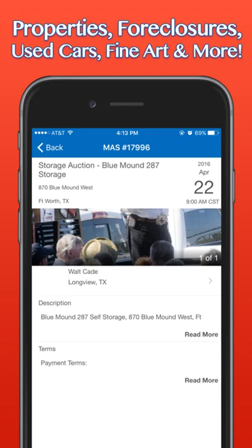 Each auction listing gives you all the info you need for informed bidding, whether you’re attending the auction online or onsite. Easily view the date, time, address, contact info, items for sale, and even directions.