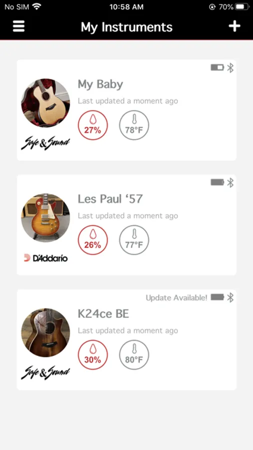 Humiditrak and Safe & Sound use a patent-pending Bluetooth sensor to provide a constant stream of temperature, humidity, and impact data to the free smart phone app to alert you of hazardous conditions that can lead to diminished playability, costly repairs, and lost value of your instrument. When Humiditrak detects dangerous conditions, notifications are sent to all your devices allowing you to take corrective action before damage occurs.