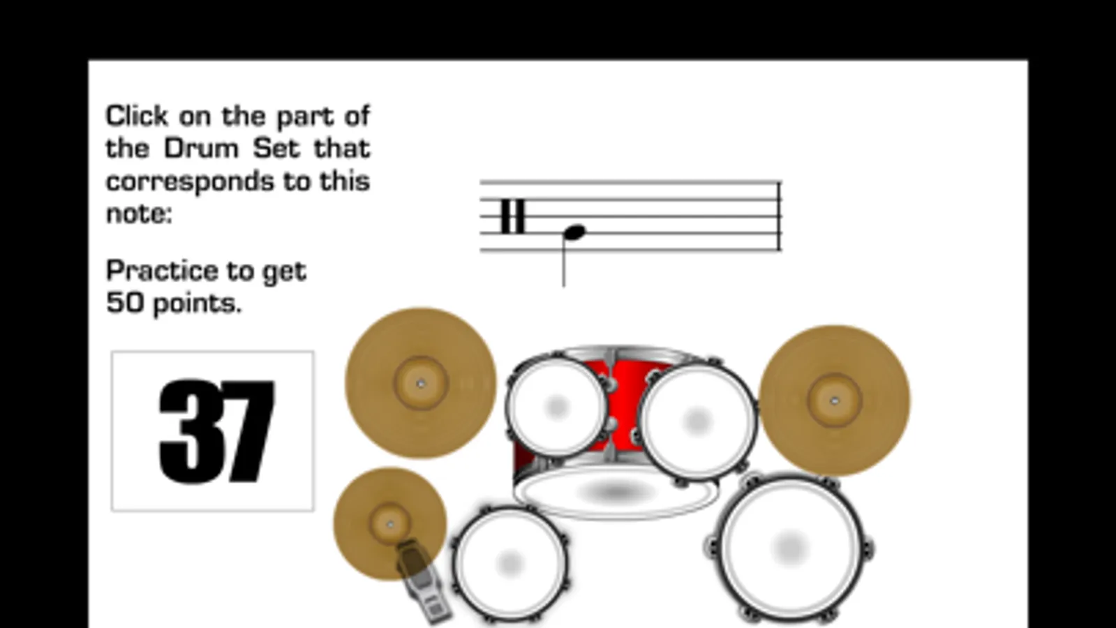 This section has exercises on which notes appear on the staff and you have to click the part of Drum Set corresponding to each particular note.