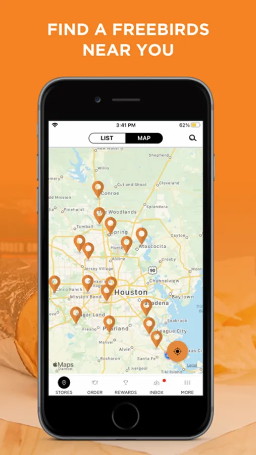 - Map view- Uses your phones GPS to find the closest Freebirds store location.
