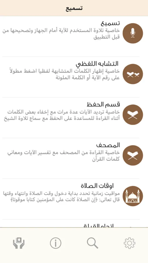 Tasmee app is simply the first and one of its kind in offering you the ability to test your Quran Memorization (Hifz) only by Reciting (Tasmee), the system will listen to you, help you when you are stuck and warn you when you recite wrong words or verses, thanks to the bliss of Speech Recognition Technology, you no longer need your friend, brother, or anyone else to stick around all day long until you are ready to test your Memorization (Hifz), with Tasmee app you can Recite (Tasmee) any surah or even part of surah at any time with a single button press.
