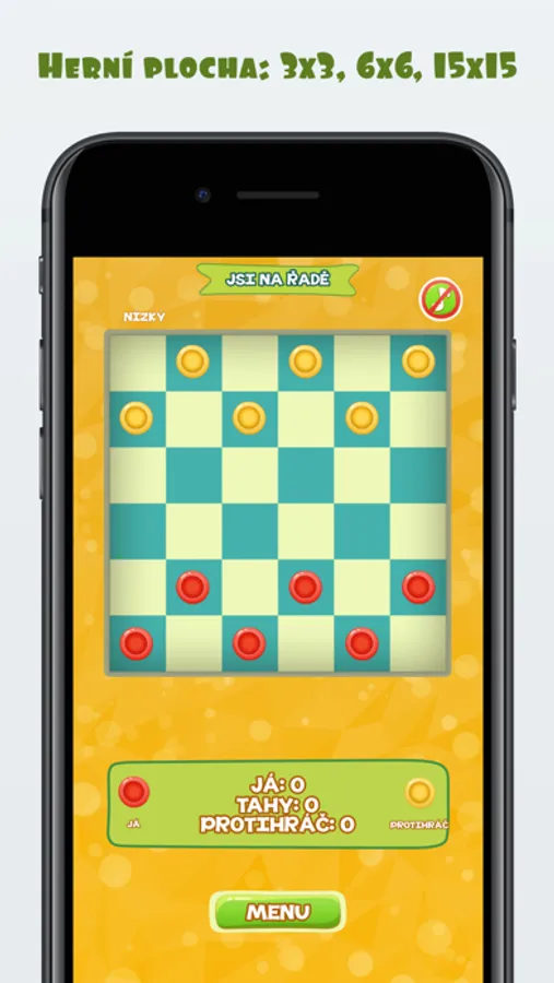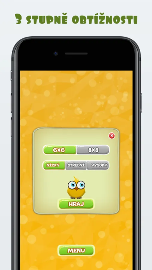 Můžeš si vybrat ze dvou dostupných herních ploch: 6x6, 8x8. Každá herní plocha nabízí tři stupně obtížnosti podle tvých dovedností.