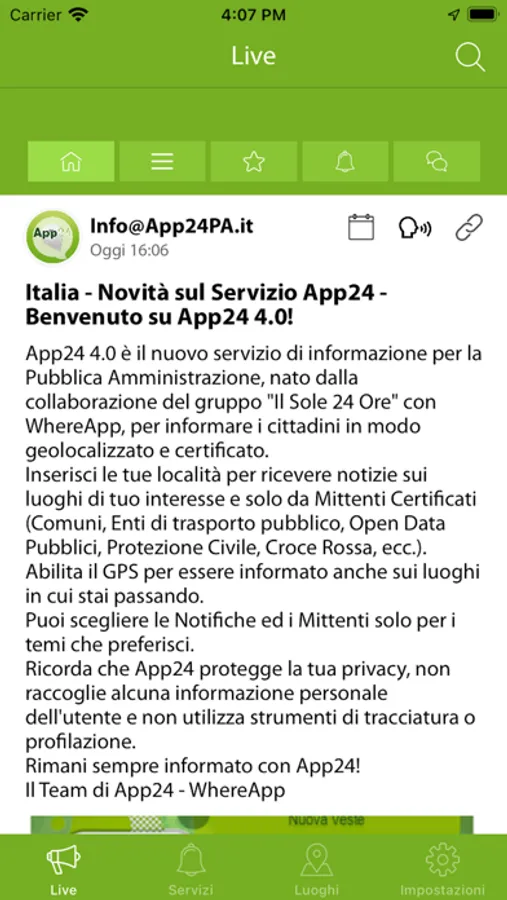 Per il cittadino App24 è una App unica e gratuita attraverso la quale riceverà informazioni sui propri punti di interesse (la casa, l’ufficio, la casa di villeggiatura, ecc.) o sui luoghi in cui si trova a passare.