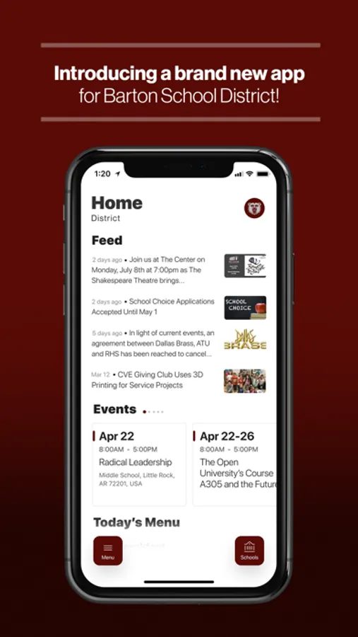 The event section shows a list of events throughout the district. Users can add an event to your calendar to share the event with friends and family with one tap.