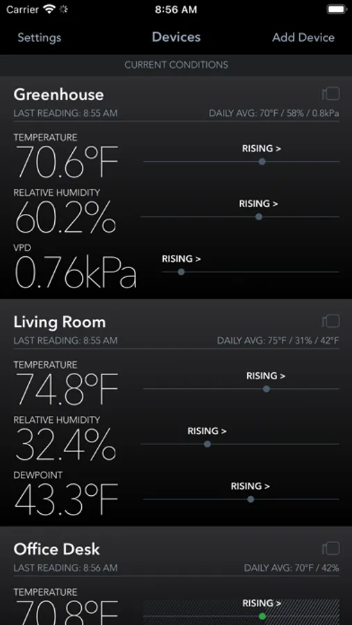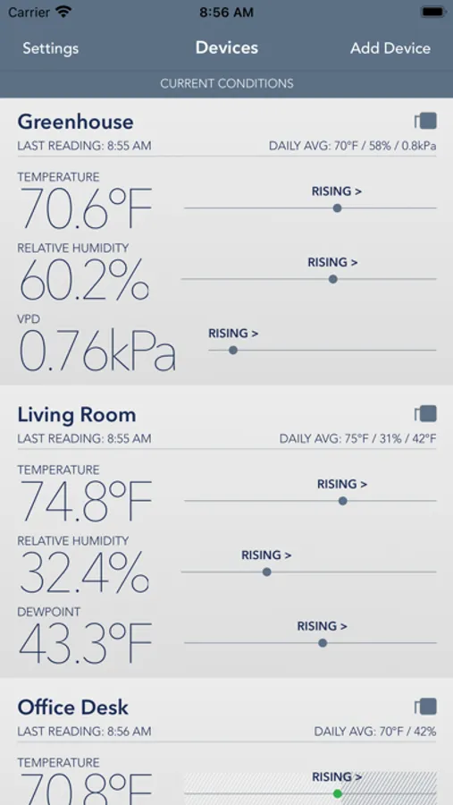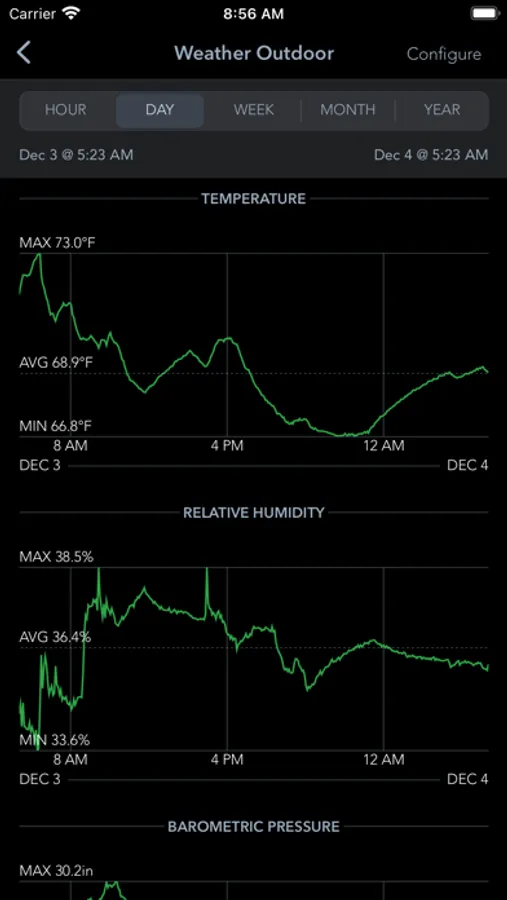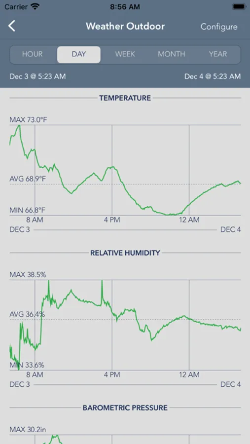 In addition to the elegant current conditions and time series displays, the distribution views give you instant insight into what temperature and humidity levels are most prevalent in a location and what the extremes were for the previous hour, day, week, month, or year.
