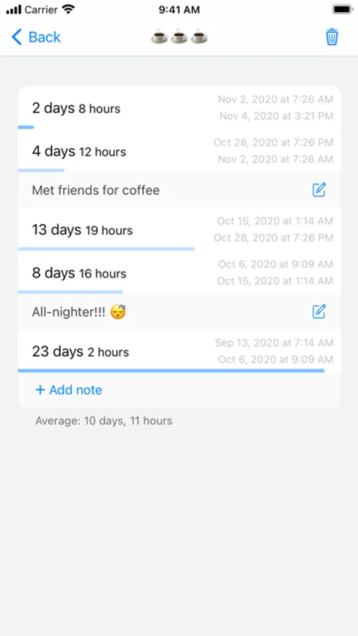 Trying to cut down on coffee? Keep track of how many days you've gone without it. Had a rough night and had a cup? Just press reset and start the count again. (Pressed reset by accident? Don't worry, there is an undo button just in case.) Also keep an eye on your streaks, to keep track of progress.