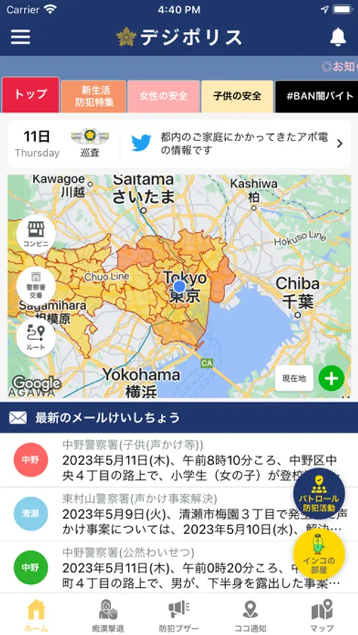 DigiPoliceは、警視庁生活安全総務課が東京都内の犯罪発生情報や防犯情報をお届けする防犯アプリです。