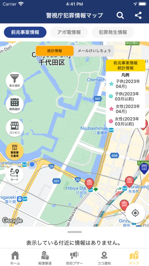 DigiPoliceでは、マイエリアを設定すると、設定した地域の犯罪発生状況がトップ画面に表示されます。